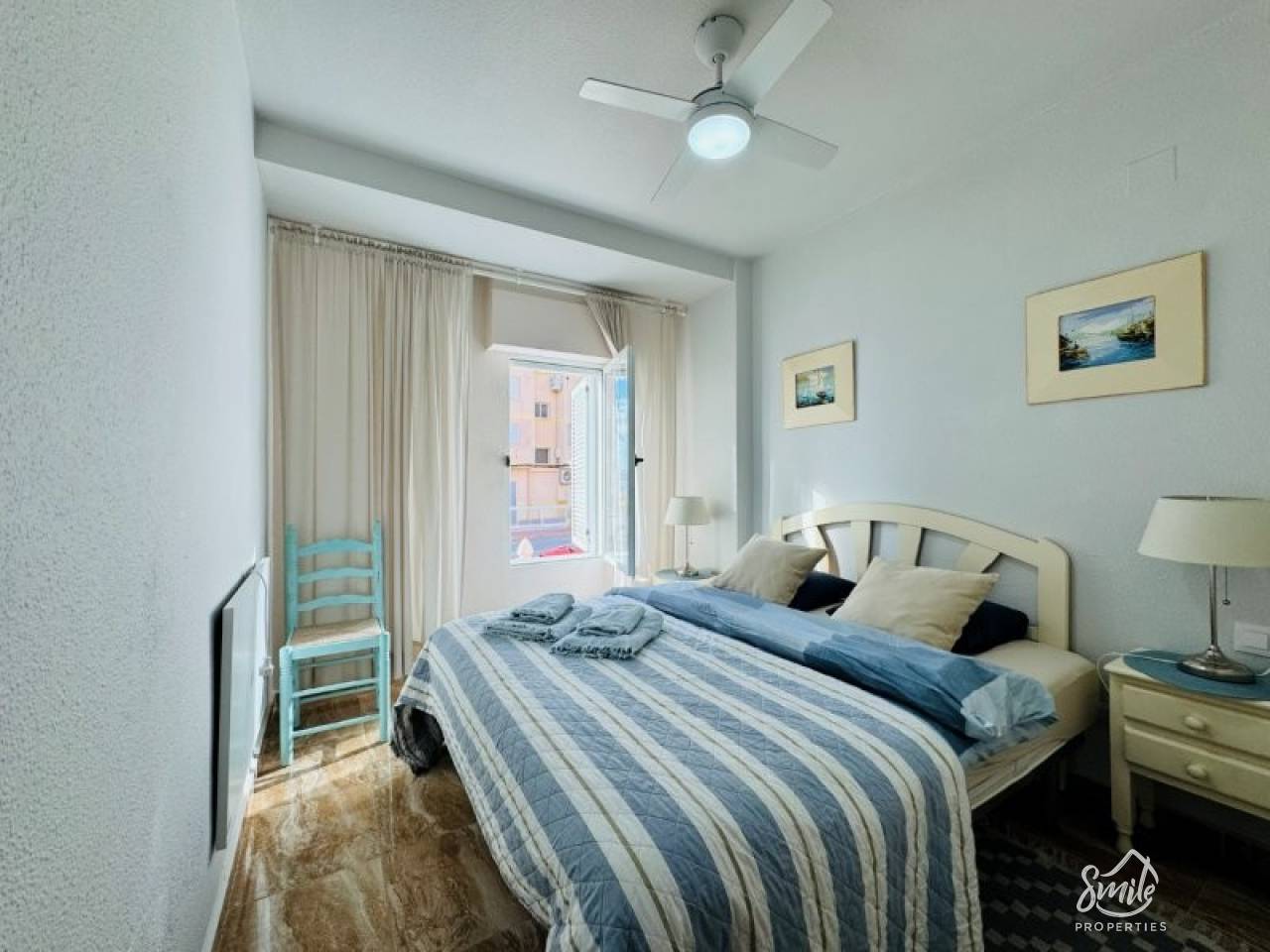 It's situated in the Puerto Romano urbanization in La Mata. The apartment offers approximately 56 square meters of living space, comprising a living/dining room, open-plan kitchen, two bedrooms, a full bathroom, a terrace, and an interior patio.